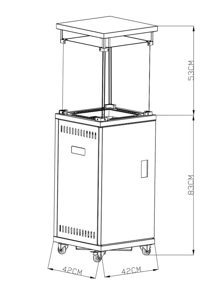 Standing at 136 cm tall with a powerful 11 kW heat output, the unit features a pulse ignition system for quick and reliable lighting. Fueled by propane, butane, or LPG, it offers a smokeless, adjustable flame via an easy-to-use control knob. A concealed compartment neatly houses a 20lb gas tank, enhancing both safety and appearance. For added peace of mind, it includes an anti-tilt auto shut-off system.